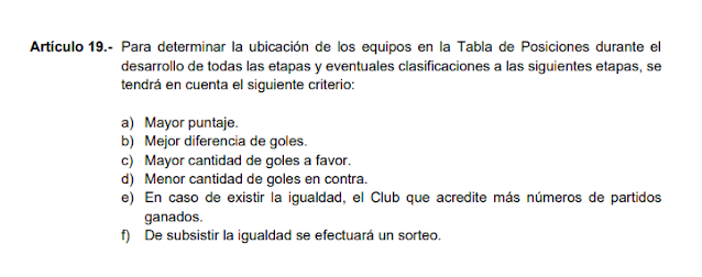 En las Bases Específicas del Campeonato, Título I, Art. 19, se establece cómo se define la clasificación a las siguientes etapas: "para determinar la ubicación de los equipos en la Tabla de Posiciones durante el desarrollo de todas las etapas y eventuales clasificaciones a las siguientes etapas, se tendrá en cuenta los siguientes criterios: a) Mayor puntaje, b) Mejor diferencia de goles, c) Mayor cantidad de goles a favor, d) Menor cantidad de goles en contra, e) En caso de existir la igualdad, el equipo con mayor número de partidos ganados, f) De subsistir la igualdad se efectuará el sorteo".